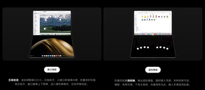 传统笔记本的核心痛点是“便携”与“大屏”不可兼得:要大屏就得妥协重量与体积。而这背后,是三十余年主流笔记本形态难有本质突破——传统PC厂商被系统、硬件、交互的协同壁垒束缚:要么因依赖第三方系统,无法为硬件创新做底层优化;要么关键硬件研发整合能力不足,且交互逻辑固化,形态创新浮于表面。最终导致此前行业的折叠屏电脑,始终未能形成市场影响力。