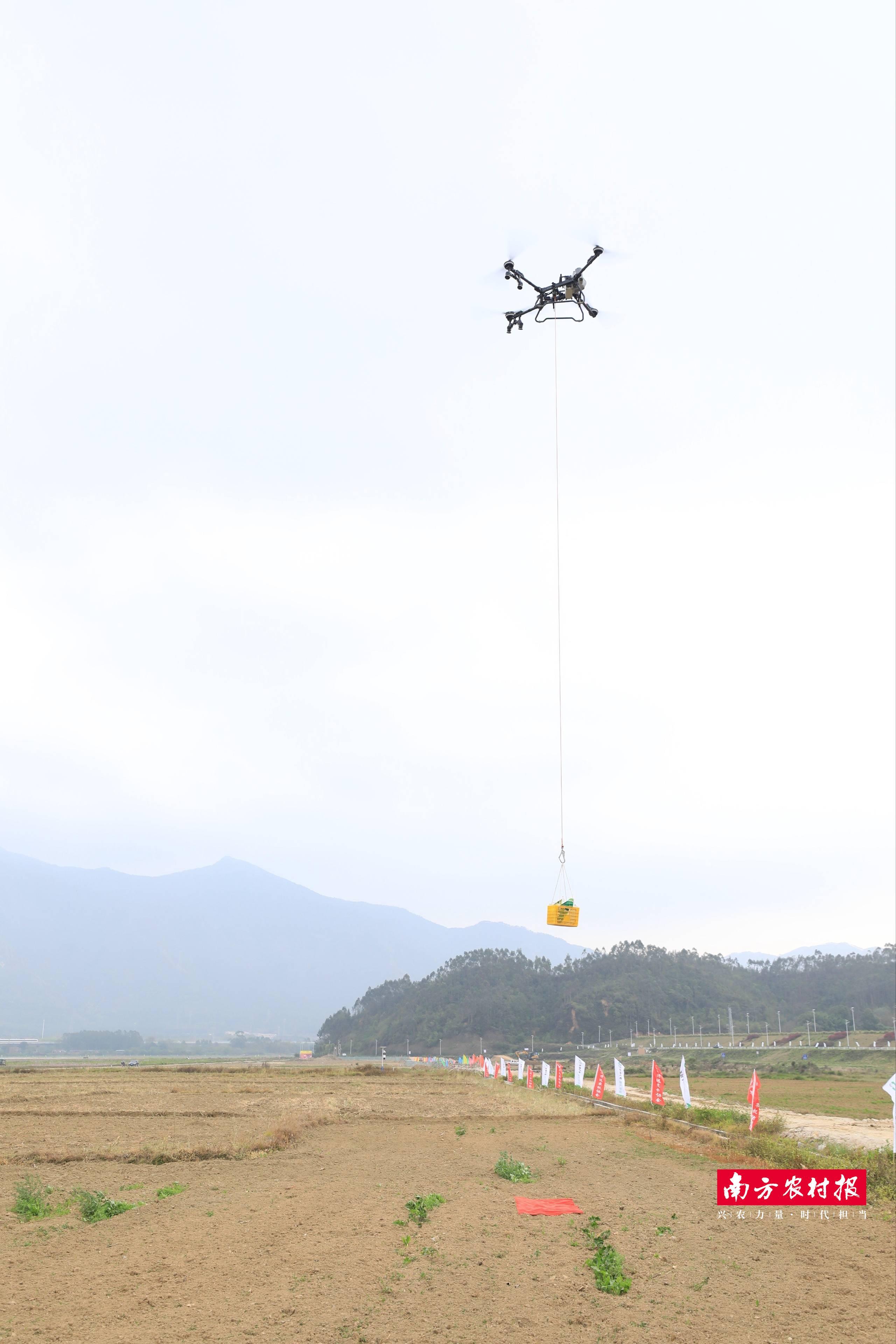 现场会上还举行了农业无人机吊运技能练兵活动。来自省内外以及清远本地的多名“飞手”熟练操控无人机,在田中进行农作物吊运比赛,开启一场技能与速度的精彩演示。